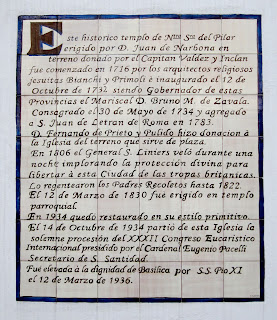 This afternoon we enjoyed a brief visit in the beautiful church, the Basilica Nuestra Senora del Pilar. This is close to the famous Cimenterio de la Recoleta, where Evita (Eva) Peron was finally buried. A sign, beautifully painted on tiles, indicates that this church was founded in the early 1700s and elevated to basilica by Pope Pius XI (March 12, 1936). It is not a large church, holding possibly no more than 300 comfortably on the pews, but with ample open tiled floor for additional seating if required.